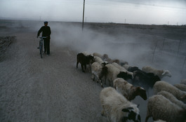 Bicycles and donkey carts alike pass through a poplar-lined street....