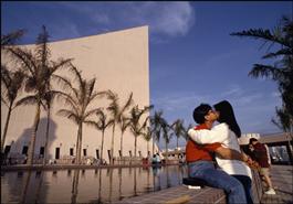 China. Hong Kong. Couple kissing with Cultural Centre behind....
