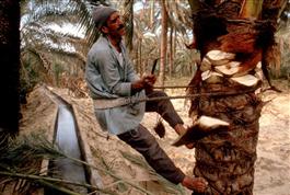 Africa. Egypt. Near Alexandria. Farmer pruning date palms...