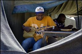 A refugee from Liberia, christian, has made a music instrument...