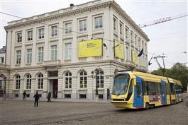 BELGIUM. Brussels. 2009. Place Flagey. Tramway and art display....