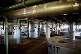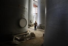 Two Inkai JV employees inspect and clean a uranium solution tank...