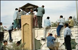IRAQ. Baghdad. Young men climbing onto the wall of the Army Security...