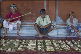 INDONESIA. BALI. Gianyar. Offerings of fruits, cakes and roasted...