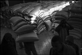 ETHIOPIA. Oromia Region. Ali town. Two men handle a 100 kg bag...