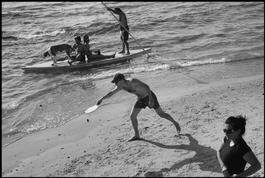 ISRAEL. Tel Aviv. April. Playing ball on the beach. Dog on a...
