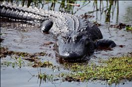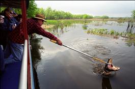 USA. Louisiana. Near Gibson. Ron 'Black' Guidry feeds an alligator...