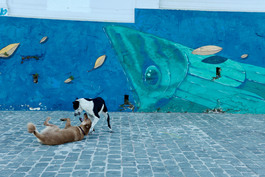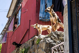 CHILE. Valparaiso. 2017. Barrio Artilleria. Playing street dogs....