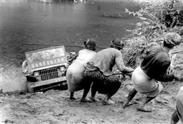 BURMA. WWII. Kachin villagers drag George RODGER's jeep out of...