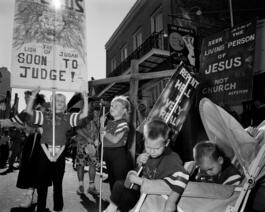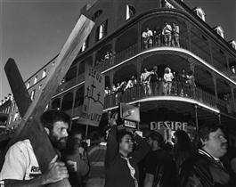 USA. New Orleans. Mardi Gras. Street evangelist before brothel,...