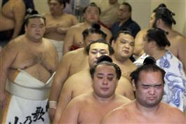 Tokyo ,Japan. Sumo. Tournament at Kokugikan, Sumotri wait to...
