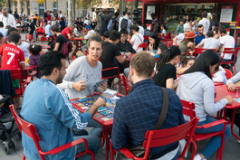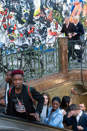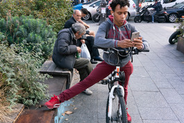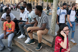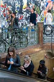 France. Paris. Smartphone users emerging from the Place de Clichy...
