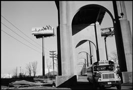 USA. Perth Amboy, New Jersey. 2000. A school bus rolls beneath...