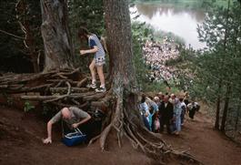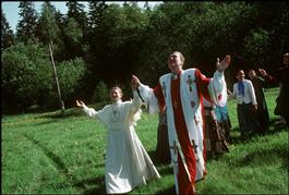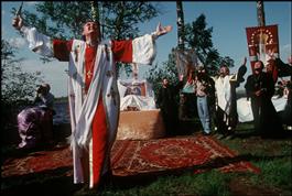 RUSSIA. Velikoretskaya. 1998. Worshipping a tree, pagan ritual...
