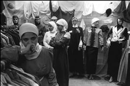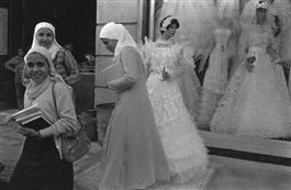 EGYPT. Tanta. 1987. Veiled students pass by wedding dresses in...
