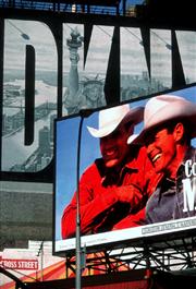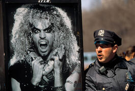 1994. A police officer next to a billboard at Grand Army Plaza...