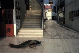 TURKEY. Antalya. 1998. A peacock struts in front of a bar.