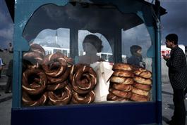 TURKEY. Istanbul. 1998. Selling simits (like Turkish sesame bagels)...