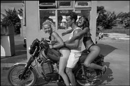 Cienfuegos City. Group on motorcycle stopping at gas station....