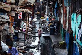 INDIA. Mumbai. 2006. A girl walks along a water pipe in the Industrial...