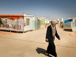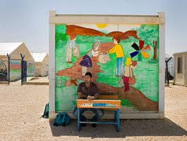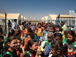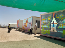 JORDAN. 2016. Outside the school at the Za'atari camp, where...