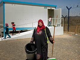 JORDAN. 2016. Cleaners in the Za'atari camp working under the...