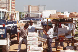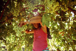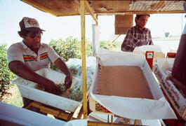 USA. California. 1988. Pickers bring grapes to stands where they're...